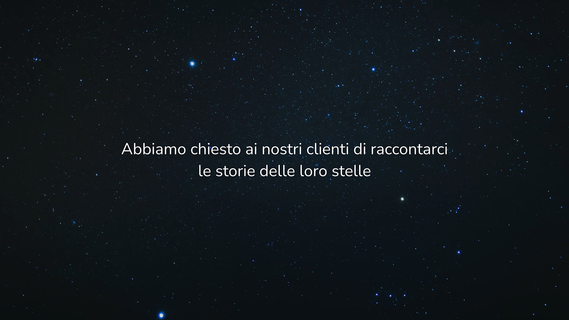 Questo Natale io e marito andiamo, come tutti gli anni, insieme alla nostra famiglia nella casa di montagna, per passare le feste tutti insieme. Anche quest’anno lo trovo difficilissimo trovare un regalo di Natale per mio marito. Alessandro, mio marito, l’hanno scorso mi ha regalato un bellissimo bracciale d’oro. Quest’anno non posso fare di meno. Visto che la mia amica Letizia mi parlava della stella che lei aveva regalato al suo fidanzato, mi sembra una buona idea regalare anch’io una stella. Visto che la confezione verrà recapitata nella nostra casa in montagna, devo sperare solo in un Natale con cielo sereno, così la notte di Natale io e Alessandro possiamo subito cercare le coordinate nel cielo.